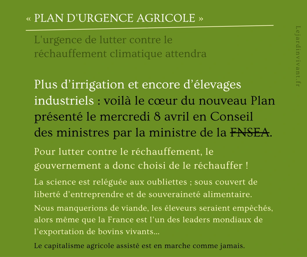 Un article dans La Charente libre de jeudi au sujet de mon travail : LIRE. Par ailleurs, le gouvernement a présenté cette semaine son « PLAN D’URGENCE AGRICOLE. » (source) Pour lutter contre le réchauffement climatique, il a donc choisi de l’aggraver ! Lire le résumé.